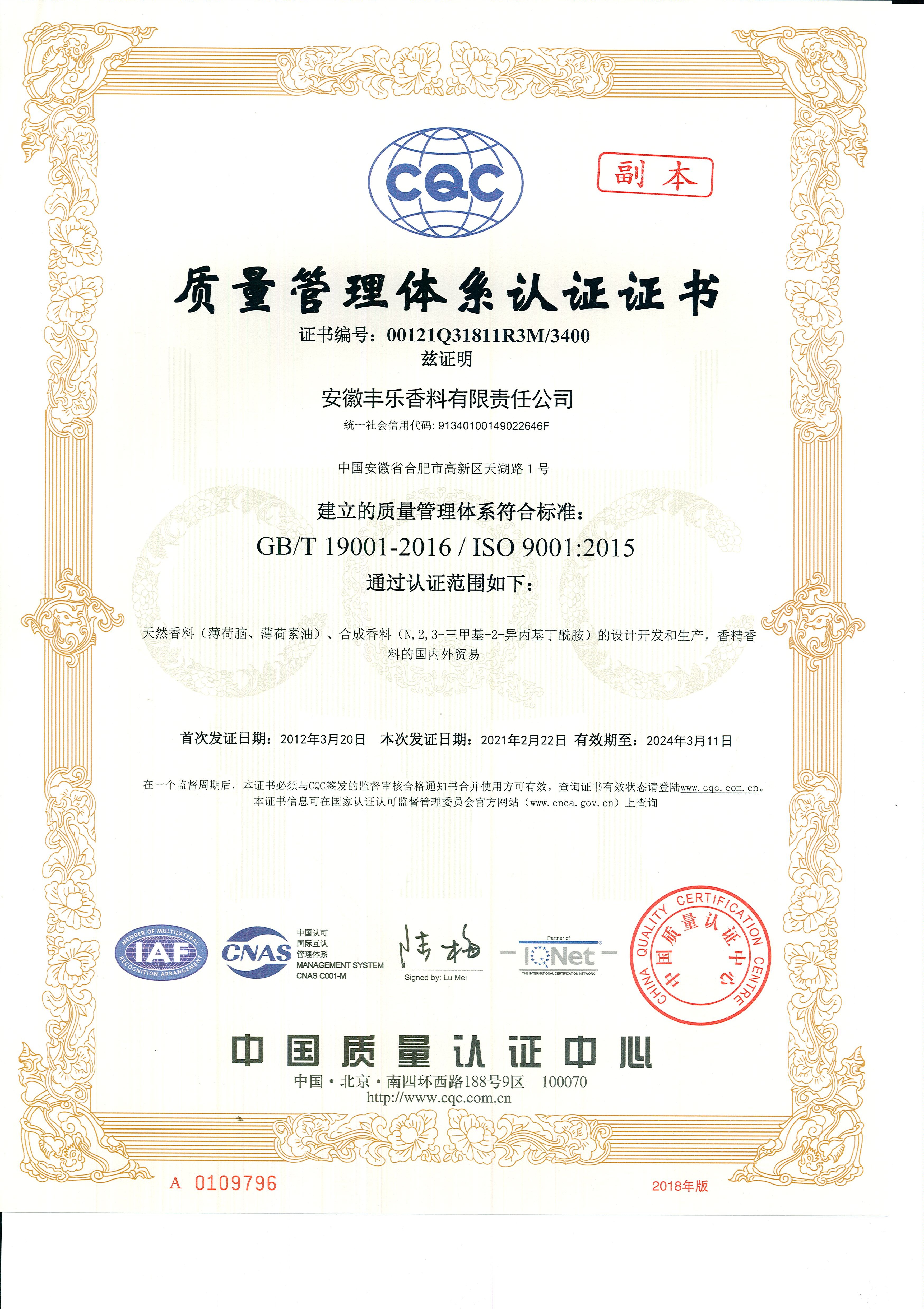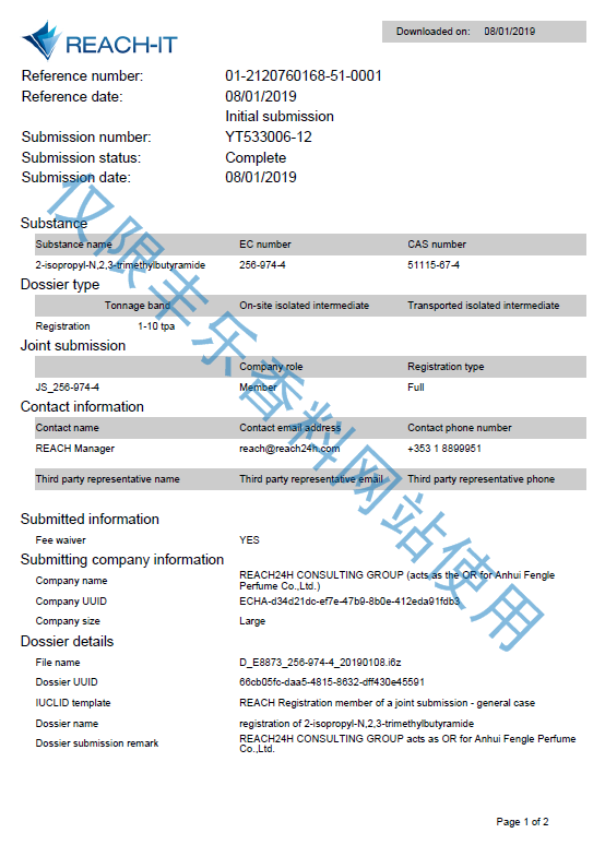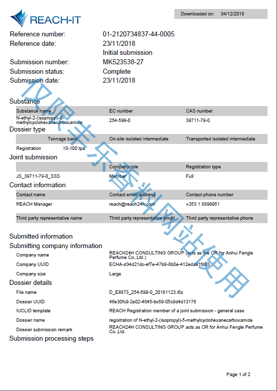 薄荷腦 REACH注冊(cè)證書(shū)